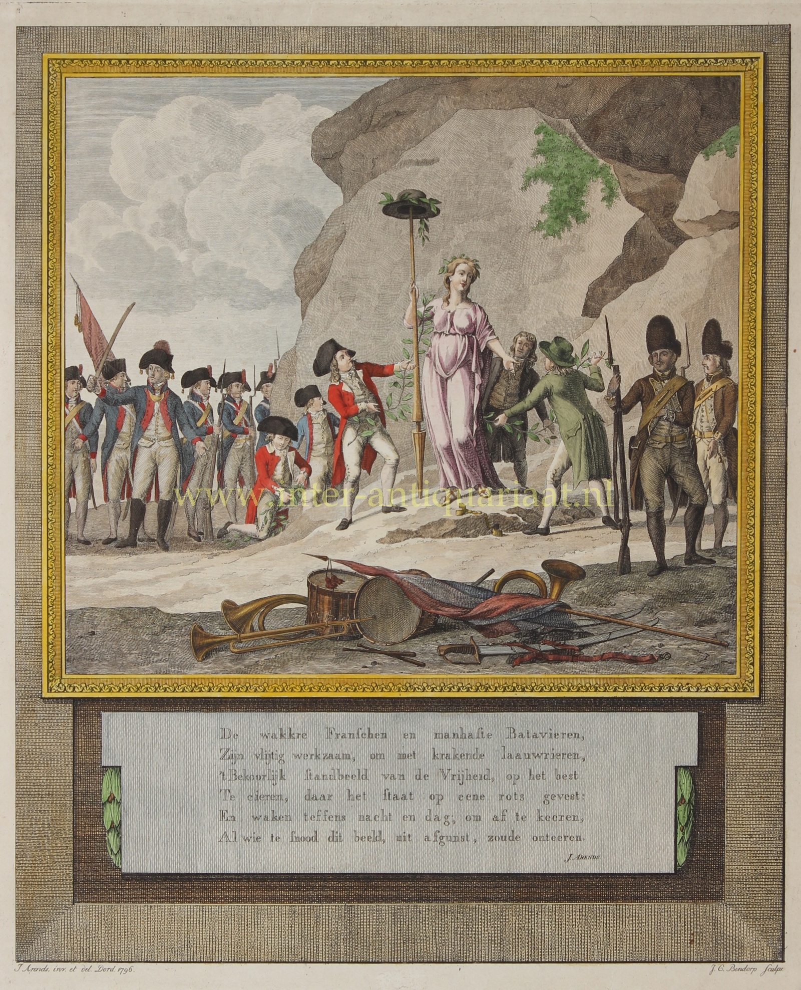 Kopergravure vervaardigd in 1796 door Johan Christiaan Bendorp naar het ontwerp van J. Arends. Later met de hand gekleurd. Afm. (plaatafdruk) 33,2 x 30,5 cm.