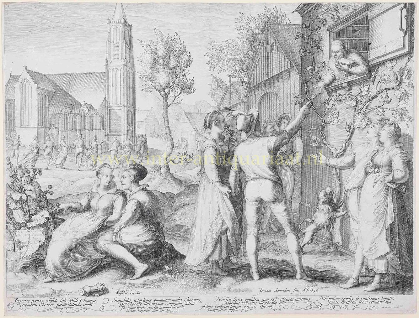 Jonge paren maken plezier en negeren de waarschuwingen van een geleerde, gravure vervaardigd door Jan Saenredam in 1596 en uitgegeven door Claes Jansz. Visscher. 2e staat (van 2). Afm. 30,3 x 40,1 cm.