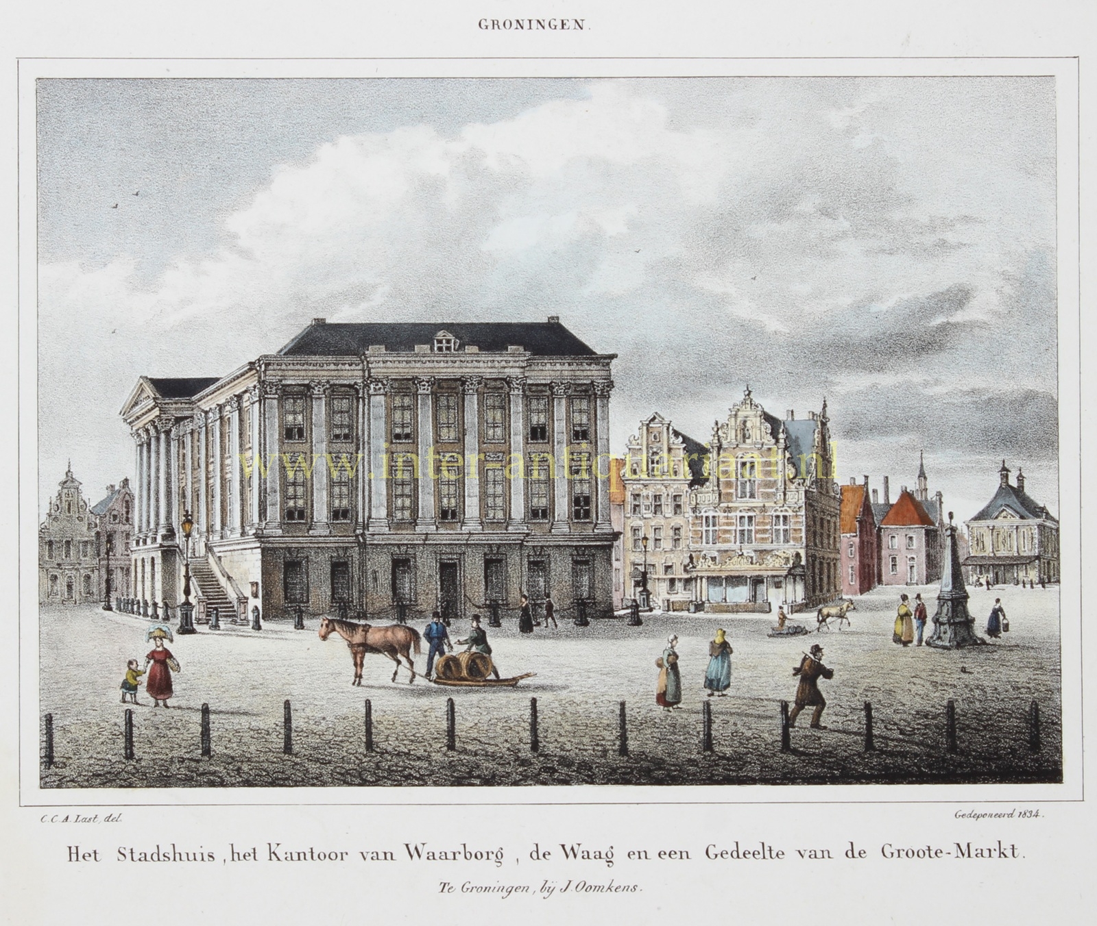 “Groningen – Het Stadshuis, het Kantoor van Waarborg, de Waag en een Gedeelte van de Groote-Markt“, lithografie vervaardigd naar een tekening van Carel Christiaan Anthony Last en uitgegeven door Jan Oomkens in 1834. Later met de hand gekleurd. Afm. (incl. tekst): 16 x 19,5 cm.