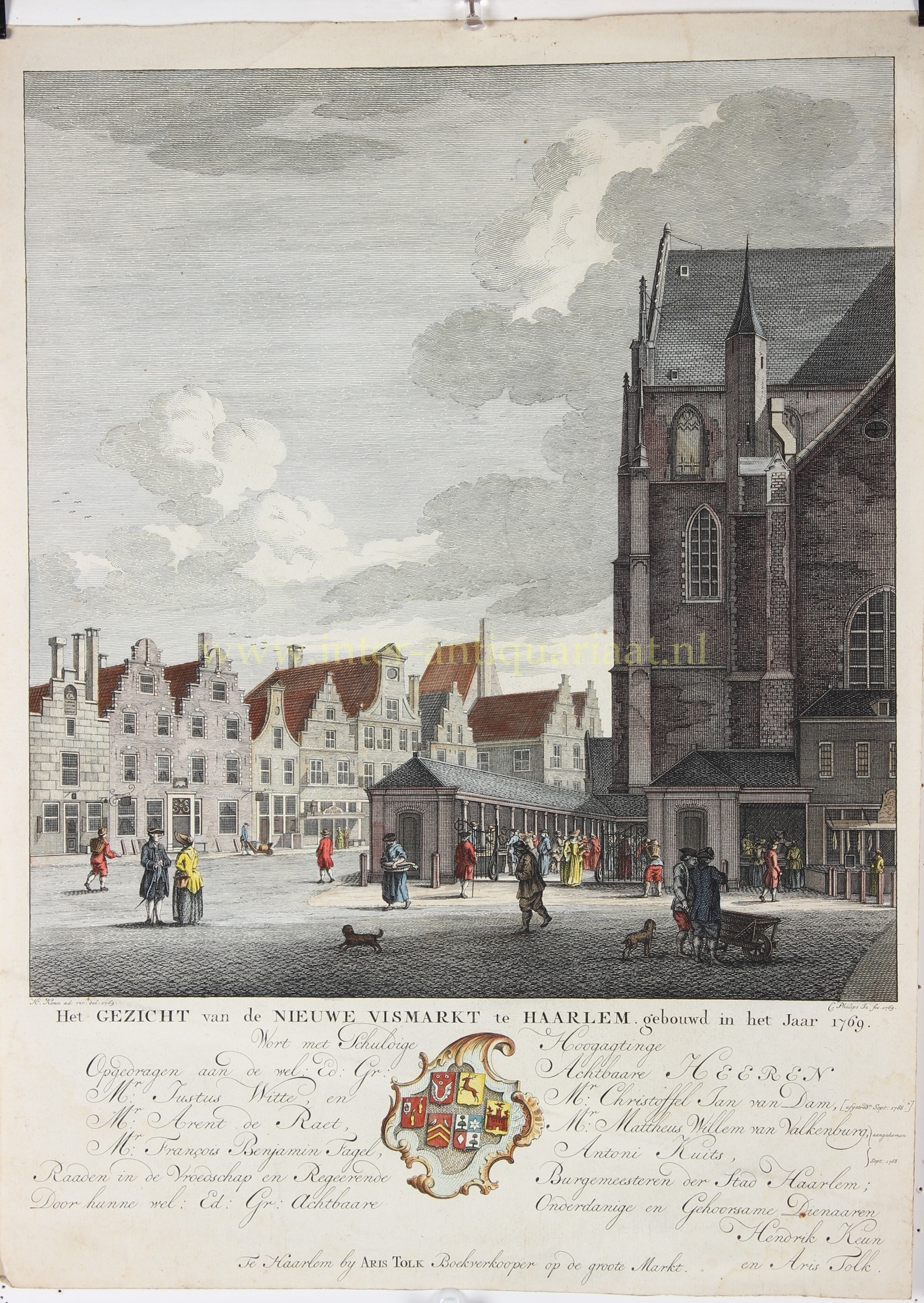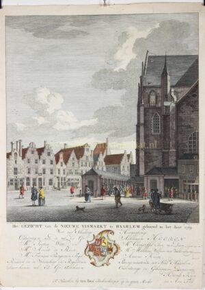 “Het Gezicht van de Oude Vismarkt te Haarlem, vernietigt in het Jaar 1768.” en “Het Gezicht van de Nieuwe Vismarkt te Haarlem, gebouwd in het Jaar 1769.” Kopergravures vervaardigd door Caspar Jacobsz. Philips naar tekeningen van Hendrik Keun en uitgegeven door Aris Tolk “Boekverkooper op de groote Markt” in 1769. Later met de hand gekleurd. Afm. elk ca. 40 x 28,5 cm., Haarlem,