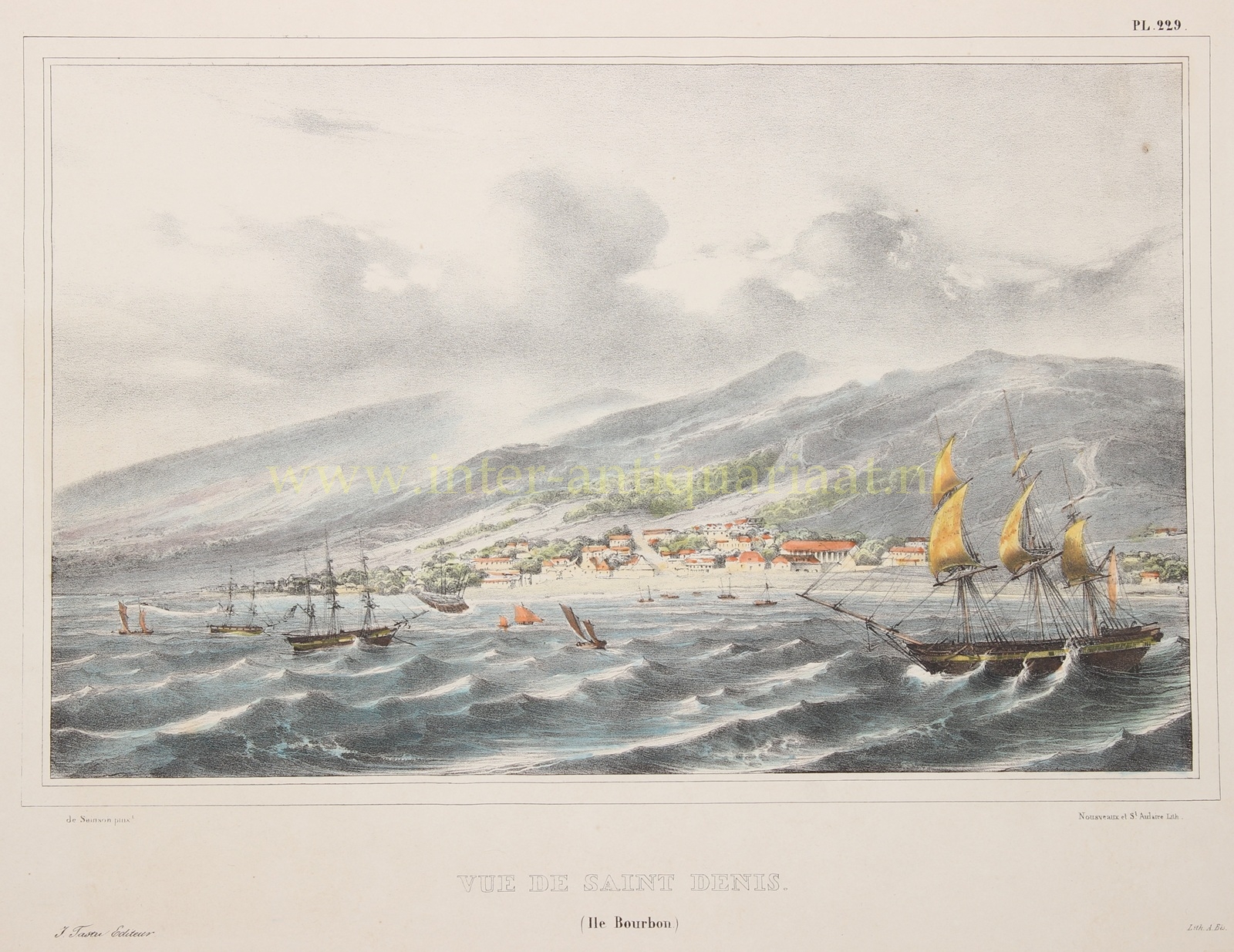 “Vue de Saint Denis”, lithografie vervaardigd door Victor Adam naar het ontwerp van Pierre de Sainson voor Jules Dumont D’Urville’s “Voyage de la Corvette l’Astrolabe 1826-29”, uitgegeven in 1833 door Louise Auguste de Tastu. In de tijd met de hand gekleurd. Afm. (voorstelling) 19 x 37 cm.