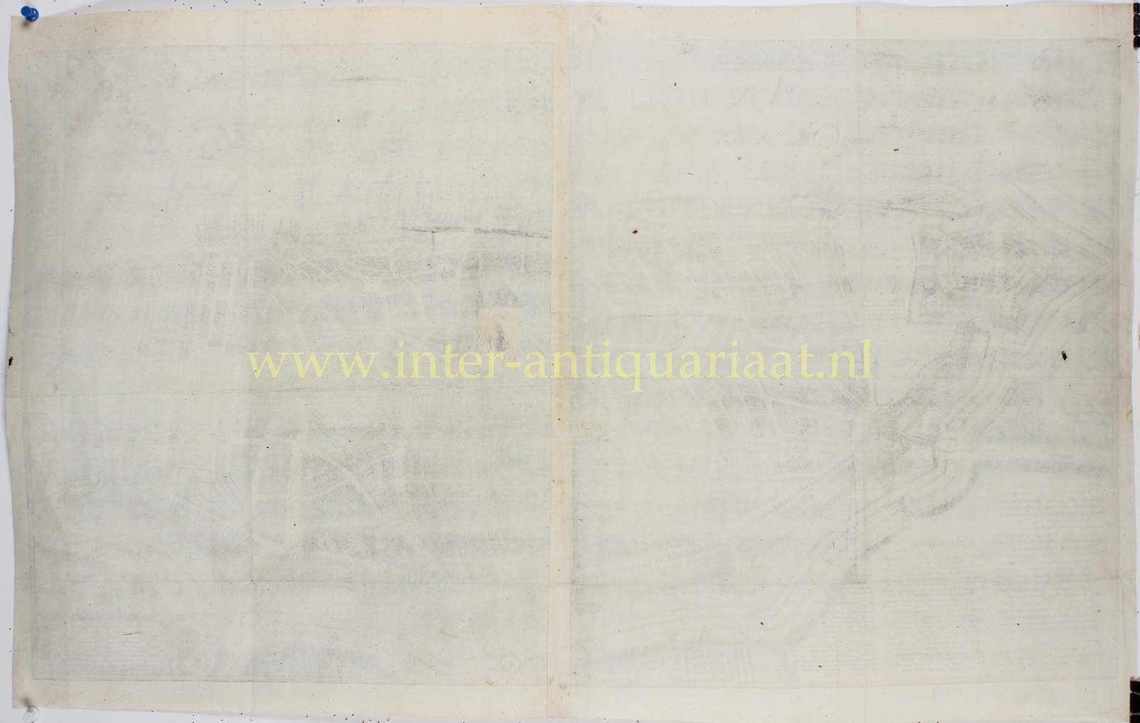 “Antverpia“, gravure vervaardigd door Georg Hoefnagel. Gedrukt van twee koperen platen. Uitgegeven te Keulen door Georg Braun en Frans Hogenberg als onderdeel van de “Civitates Orbis Therrarum” ca. 1585. Later met de hand gekleurd. Afm.: ca. 46 x 79 cm.