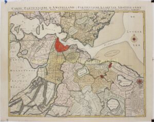 “Carte Particuliere d’Amstelland ou les Environs d’Amsterdam, Muyden, Weesp, Naarden &c. / PARTICULIERE KAART VAN AMSTELLANDT of het omleggende van Amsterdam, Muyden, Weesp, Naarden &c.” Kopergravure uitgegeven in 1749 door Johannes Covens en Cornelis Mortier te Amsterdam. In de tijd met de hand gekleurd, met latere toevoegingen. Afm. (prent): 52 x 64,5 cm.