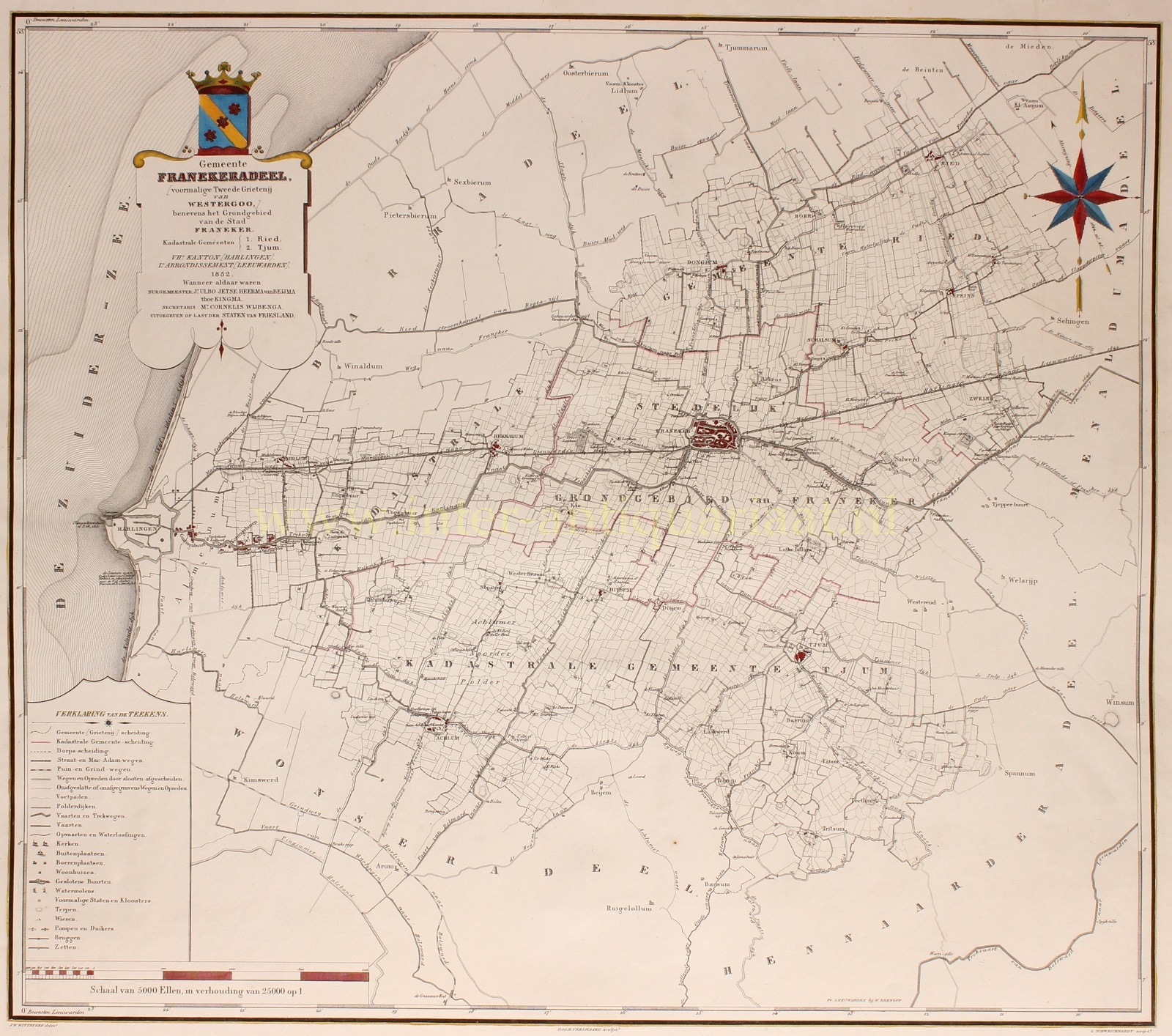 “Gemeente Franekeradeel (Voormalige Tweede Grietenij van Westergoo).” Groot formaat staalgravure vervaardigd in 1852 door Daniel Veelwaard voor de Nieuwe Atlas van Provincie Friesland van Wopke Eekhoff. Later met de hand gekleurd. Afm. ca. 57 x 65 cm.