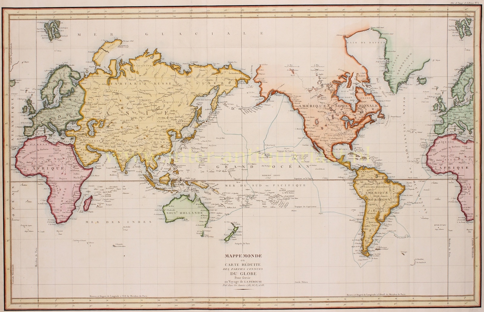 “Mappe Monde ou Carte Réduite des Parties Connues du Globe pour servir au Voyage de La Pérouse fait dans les Années 1785, 86, 87 et 88“. Kopergravure, uitgegeven te Parijs in 1797 als deel van de atlas bij het officiële verslag van de expeditie van Jean-François de Galaup, comte de La Pérouse. Later met de hand gekleurd. Afm. ca. 58,5 x 93,5 cm.