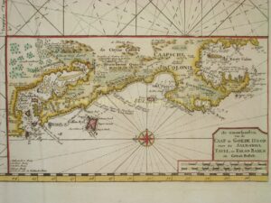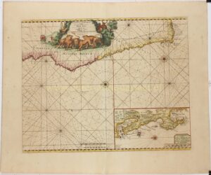 Deze fraaie paskaart toont de zuidwestkust van Afrika van Catumbela (het huidige Angola) tot aan de Kaap de Goede Hoop. Dit gebied, rijk aan maritieme geschiedenis en cruciaal tijdens het tijdperk van de grote ontdekkingen, is rijk versierd weergegeven en vol details die zowel de exotische aantrekkingskracht als de strategische betekenis voor de Nederlandse zeevaart onderstrepen.