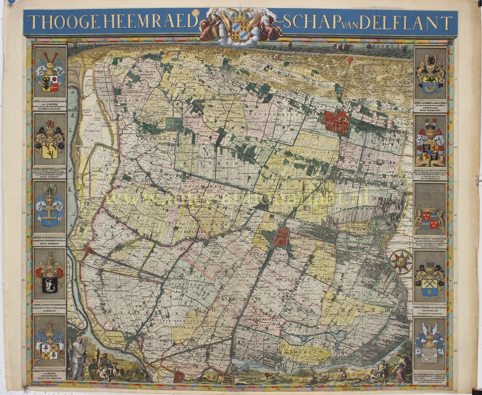 “’T HOOGE HEEMRAEDSCHAP VAN DELFLANT.” Copper engraving, reduced overview map taken from the atlas-bound 25-sheet map of “‘t Hoogheemraedschap van Delflant: met alle de Steden” [Hoogheemraedschap (water authority) of Delflant with all its towns], surveyed and mapped by the admitted land surveyors Nicolaus and Jakob Cruquius. Published in 1712. Later hand-coloured. Size approx. 52 × 58.5 cm.