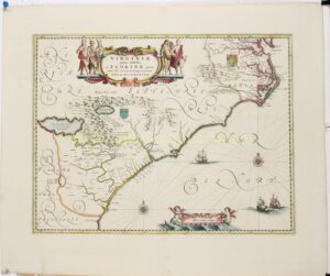 THe map depicts the southeastern coast of North America, from present-day Virginia in the north to Florida in the south, including the lands in between. The geography is based on earlier cartographic sources, notably the influential work of Hondius and Hessel Gerritsz, yet enhanced with information gathered during the various explorations of the area and Blaeu’s hallmark elegance of engraving and ornamentation.